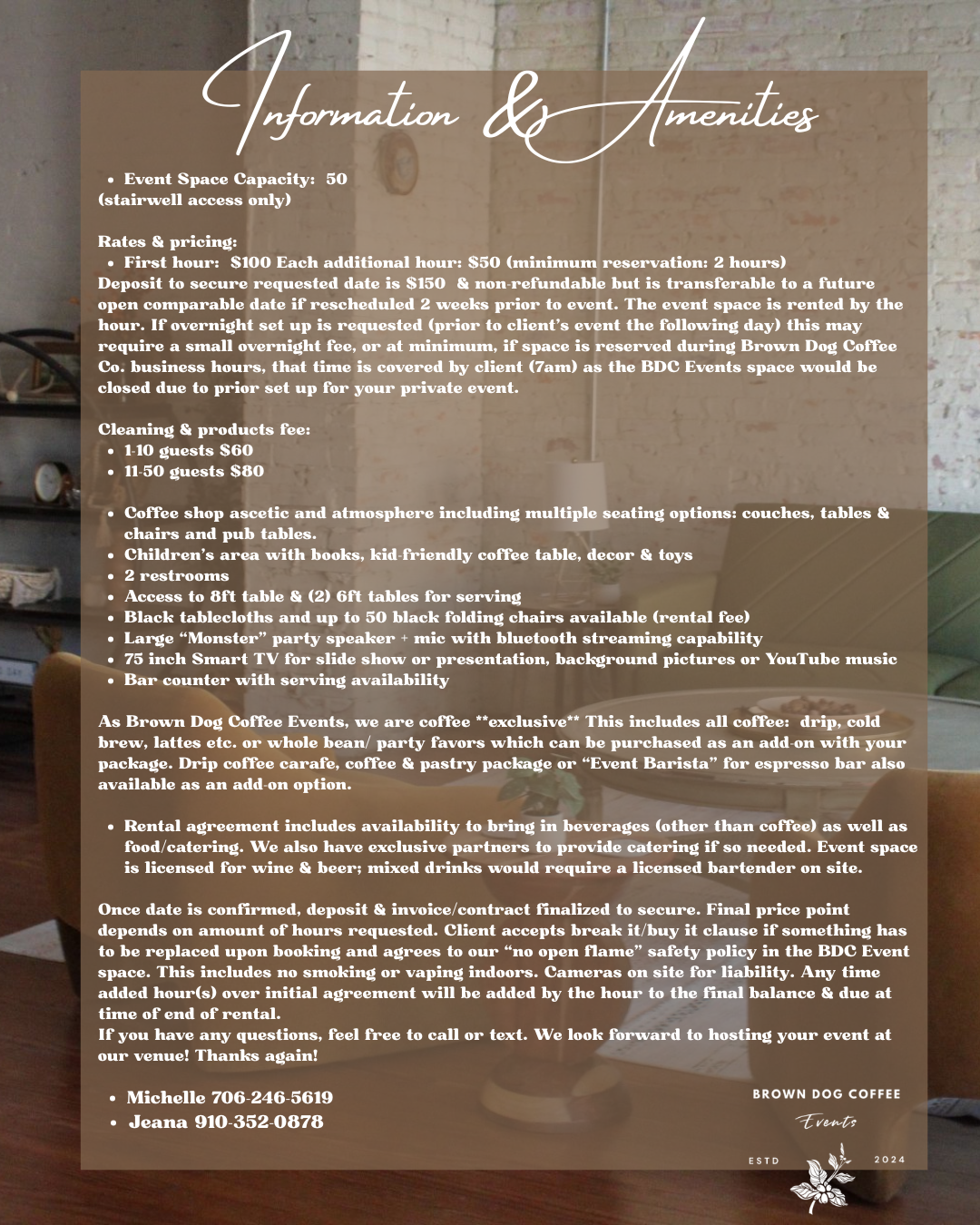 Additionally, there will be AVAILABLE times we Will have this space available for overflow Brown Dog Coffee customers when a private/rented event is not in process.